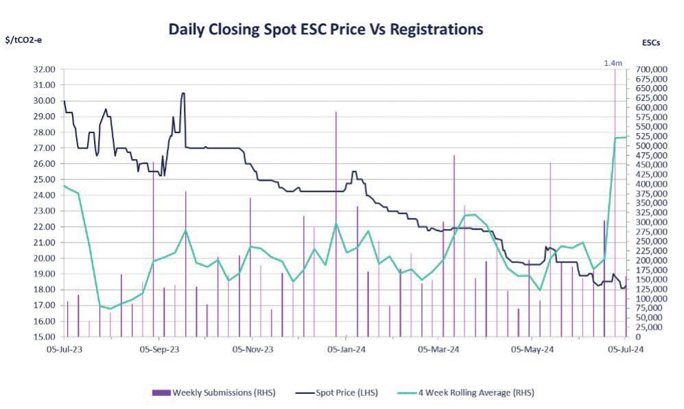 The NSW scheme by comparison continued to post consist, healthy creation across May. Then, as expected, the deadline for both 2023 creation and others ahead of scheme changes impacting Heat Pump installations and fridge/freezer activities saw June post weekly creations figures of more than 1 million units. Resultingly, the ESC spot price continued to slide to its current level of $18.25.