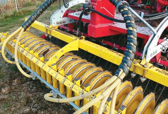 Following behind the discs are an optional row of large spring tines. These are well worthwhile, although once again set-up is critical. Adjustments can be made using pins, with a series of holes for different heights and angles. The tines are set just deep enough to push a small amount of soil along in front, so they’ll break clods and level any hollows without blocking up the machine. Cleverly, the roller on the back of the machine is mounted in its own separate frame, which pivots off the main frame. Two hydraulic rams are used to lift the roller up and down, controlling the working depth of the discs. Five millimetre thick shims on a hinge system alongside the ram spears are a simple yet effective way of fine tuning the depth. The fact they’re on a hinge means they’re always connected to the machine and there’s little chance of them getting lost.