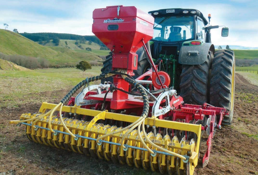Atrend in recent years has been to move away from the power harrow to unpowered mounted and trailing tillage equipment, with higher forward speeds and outputs that leave behind a well-cultivated firm seed bed. Recently, I got to check out an operation in New Zealand that has taken the plunge, largely ditching its power harrow in favour of one such machine; a Pöttinger Terradisc 3001 for cultivation. Stuart Deadman’s Totara Park farm milks cows on around 1,300 hectares north of Taupo in the central North Island. It runs an extensive re-grassing program, involving summer and winter cropping, as well as some conversion of forestry land in to pasture. Since the Terradisc was purchased early last year it has covered around 50ha and so far has proven itself more than capable in the property’s unique conditions. The light pumice soils found in this area aren’t the toughest to work up, but it does have unique challenges. Abrasive on soil engaging equipment, there’s only a minimal amount of topsoil over an infertile, yet free-draining pumice base. While Pöttinger suggests as little as 100hp (74.6kW) is required to pull the 3m Terradisc, for this test I had a John Deere 6210R hitched on the front; possibly overkill on the somewhat flat paddock we were in, but the operator says it is definitely required on some of the farm’s steeper country (and I was about to learn that maintaining a high forward speed is one of the keys to the success of this machine). The ground to be worked was winter crop that had been grazed off. While there was only a small amount of trash left on the surface, the ground was fairly compact after having cows on it. The plan was for one or two passes to be completed in order to create a seed bed for grass that was to be sown with a Hatzenbichler air seeder mounted on the back of the machine.