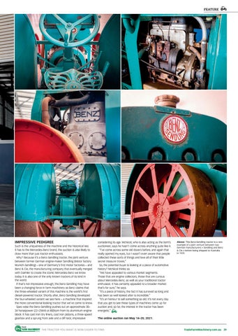 considering its age. McNicol, who is also acting as the item’s auctioneer, says he hasn’t come across anything quite like it. “I’ve come across some old dozers before, and again that really opened my eyes, but I wasn’t even aware that people collected these sorts of things and love all of their little secret treasure troves.” So, the potential buyer is looking at a piece of automotive history? McNicol thinks so. “We have appealed to various market segments. Those that are engine collectors, those that are curious about Mercedes-Benz, as well as your traditional tractor enthusiast. It has certainly appealed to a broader market that’s for sure,” he says. “It’s a piece of history, the fact it has survived so long and has been so well looked after is incredible.” “It’s an honour to sell something so old. It’s not every day that you get to see these types of machines come up for auction and, so far, the interest in the tractor has been energetic.” The online auction ran May 14–20, 2021.