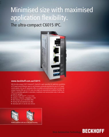 www.beckhoff.com.au/C6015 With the ultra-compact C6015 Industrial PC, Beckhoff is again expanding the application possibilities of PC-based control. Wherever space or cost limitations previously prevented the use of a PC-based control solution, this new IPC generation offers an excellent price-performance ratio in an extremely compact housing. With up to 4 CPU cores, low weight and unprecedented installation flexibility, the C6015 is universally applicable in automation, visualisation and communication tasks. It also makes an ideal IoT gateway. Processor: IntelŽ Atom™, 1, 2 or 4 cores Interfaces: 2 Ethernet, 1 DisplayPort, 2 USB Main memory: up to 4 GB DDR3L RAM Housing: Die-cast aluminium-zinc alloy Dimensions (W x H x D): 82 x 82 x 40 mm