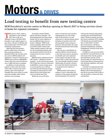 Motors & DRIVES Load testing to benefit from new testing centre SEW-Eurodrive’s service centre in Mackay opening in March 2017 to bring services closer to home for regional customers.