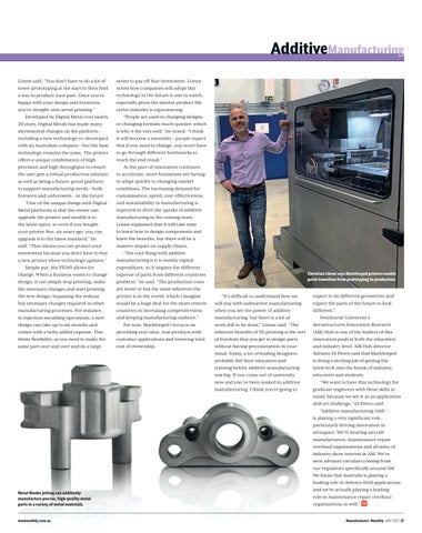4 Editor’s Note 6 Comment 8 News 18 Manufacturer Focus 22 Engineering Focus 26 Additive Manufacturing 28, 44 Compressors 31, 42 Events 38 Industrial Gases 40 Aluminium Capability 46 Welding Gases 48 What’s New 50 Last Word 2 MAY 2023 Manufacturers’ Monthly manmonthly.com.au Inside MAY 2023 18