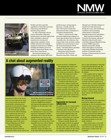 pressure on prices,” said Bassan. He explained that visitors were seeing for the first time how to digitally enable their workforce to make them more productive, efficient and safer. With augmented reality technology, manufacturers can hope to achieve their desired target outputs quicker and less error prone. “Companies like Siemens and Boeing want to improve quality and reduce rework, for example reducing errors by as much as 90 per cent for complex assembly tasks and here at National Manufacturers’ Week, almost all the visitors we spoke to could see how augmented reality will provide a capability uplift to their workforce,” said Bassan.