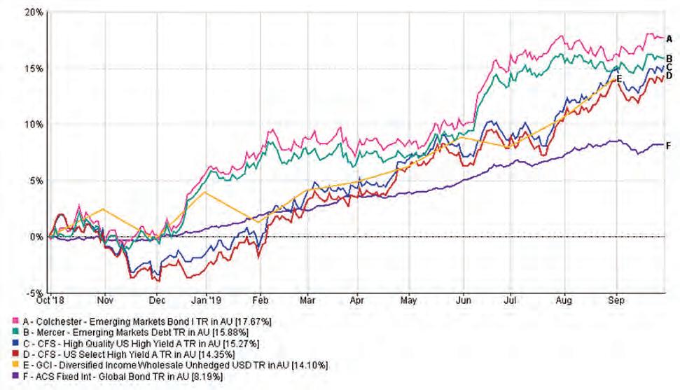 According to FE Analytics, over one year to 30 September, 2019 emerging market debt funds were the performance winner with the top fund – Colchester Emerging Market Bond I – returning 17.6%.