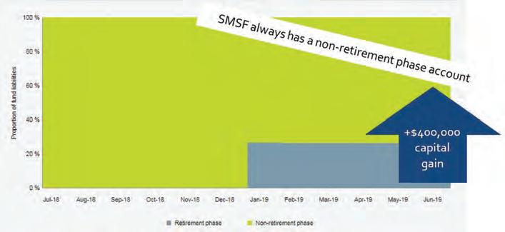 We see an illustration of the Fund liabilities in chart four. The green section shows the accumulation balance over the 2019-20 financial year and the Fund would therefore be required to use the proportionate method to claim ECPI. The capital loss realised could be carried forward, and the ECPI claimed on other Fund income would have the actuarial exempt income proportion apply.
