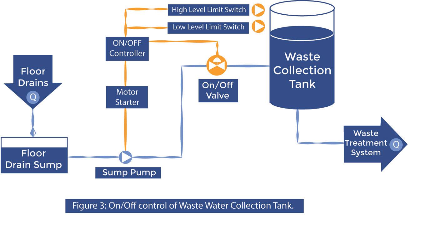 The advantage of this method is that it does not require any plant instrumentation or control valves, but the disadvantage is that there is a possibility of the floor drain sump overflowing. Also, there is additional energy costs associated with pumping more water up to the wastewater collection tank than the downstream process can handle.