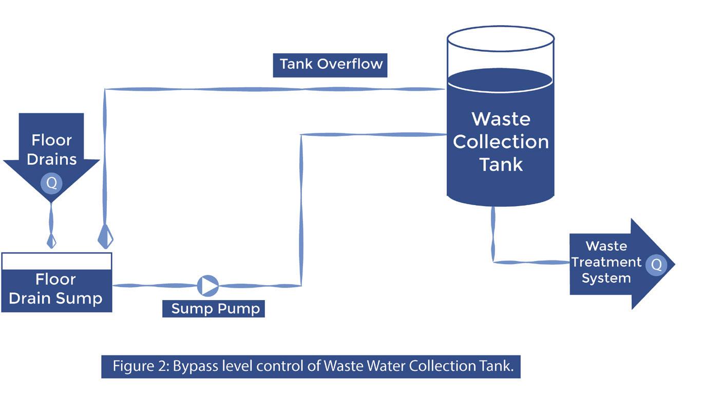 A simple method of controlling the wastewater collection tank level is using a bypass line as shown in Figure 2. The bypass consists of a pipeline running from the wastewater collection tank back to the floor drain sump or to some other location. The penetration height of the bypass line establishes the maximum liquid level in the wastewater collection tank. If the flow rate from the sump pump exceeds the flow rate out of the collection tank to the waste treatment system, the tank level will