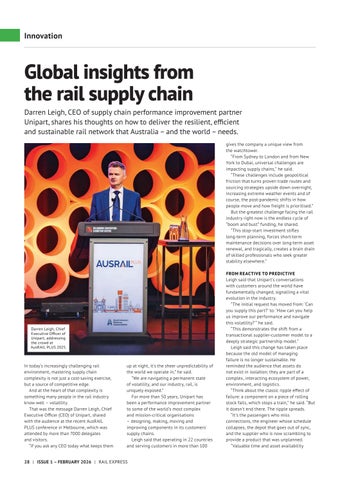Another prominent rail leader to share his thoughts in this issue is Alstom's CEO Henri Poupart-Lafarge. Henri flew all the way from Paris to Melbourne to address the crowd at AusRAIL about the global rail revolution and the part Alstom has to play. Also at AusRAIL, CEO of Unipart Darren Leigh gave a