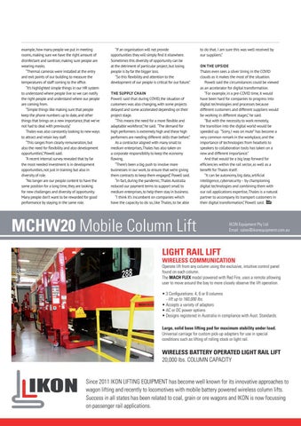 to do that. I am sure this was well received by our suppliers.” ON THE UPSIDE Thales even sees a silver lining in the COVID clouds as it makes the most of the situation. Powell said the circumstances could be viewed as an accelerator for digital transformation. “For example, in a pre-COVID time, it would have been hard for companies to progress into digital technologies and processes because different customers and different suppliers would be working in different stages,” he said. “But with the necessity to work remotely, the transition into the digital world would be speeded up. “Sorry, I was on mute” has become a very common remark in the workplace, and the importance of technologies from headsets to speakers to collaboration tools has taken on a new and different importance.” And that would be a big leap forward for efficiencies within the rail sector, as well as a benefit for Thales itself. “It can be autonomy, big data, artificial intelligence, cybersecurity – by championing digital technologies and combining them with our rail applications expertise, Thales is a natural partner to accompany its transport customers in their digital transformation,” Powell said.