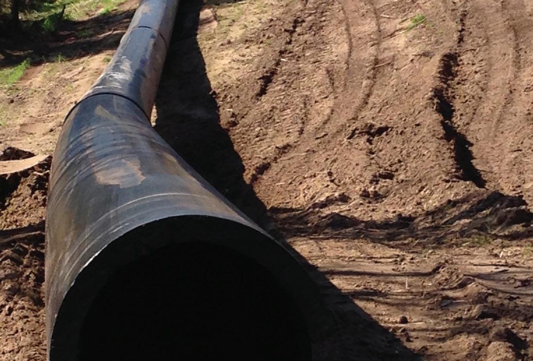 HDPE is a pipe typically used for HDD installation and offers low skin friction. This pipe, however, requires a trail out trench which is detrimental to the shaft construction and the overall advantage of the keyhole pipeline. Furthermore, the need to string out the line to reduce installation time would limit the jobsites where this pipe would be practical to install. The limitation of force that the pipe can manage also creates some issues with the minimal overcut common in microtunnel installations. The flexibility of the pipe is ultimately detrimental to ultimate precision.