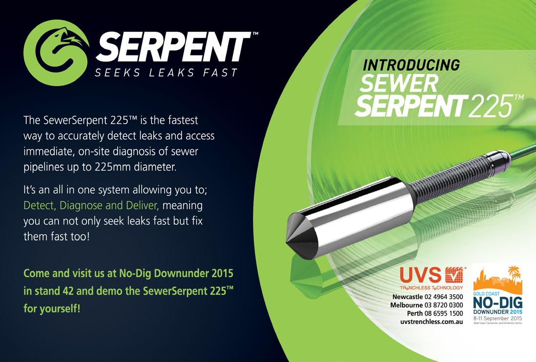 MAJOR FEATURES SOLAR DAMS SAFETY BIG DATA SPECIAL FOCUS UTILITY LOCATION SEWER REHABILITATION EMBEDDED NETWORKS DISTRIBUTED GENERATION EQUIPMENT & MACHINERY SWITCHGEAR CABLE PLOUGHING DRONES PUMPS, VALVES, COMPRESSORS AND FILTERS ADITC 83 AHD Trenchless 33 Arup 61 Austeck OBC BVCI 81 Cleanteq Aromatrix 48 Comdain Infrastructure IFC CSC 39 Edge Underground 58 Evoqua Water Technologies 30 Hydroflux 14 Icon Water Limited 15 ITS Pipetech 25 Jetstream Drain Cleaning 35 Lord Civil IBC Odour Technologies 29 Open Windows 5 Oracle 58,65 Pezzimenti Trenchless 49 Pipe Management Australia 37 Pipeline Specialty Supply Services 13 Pivotel 69 Qmax Pumping systems 19 Quantum Filtration Medium 31 SATEC Australia 67 Select Solutions 11 Shore Hire 53 SmartNet Aus 59 Stockton Drilling Services 63 Taylors 18 Thales 1 Total Drain Cleaning Services 2-3 Trility 23 UVS 47 Vacuworx Australia 51 Vermeer 9 Vortex Hire 45 WIOA Victorian Conference 85 Advertisers’ index SALES DEADLINE 24 MARCH 2016 SALES DEADLINE 17 JUNE 2016 SALES DEADLINE 11 SEPTEMBER 2015 SALES DEADLINE 4 DECEMBER 2015