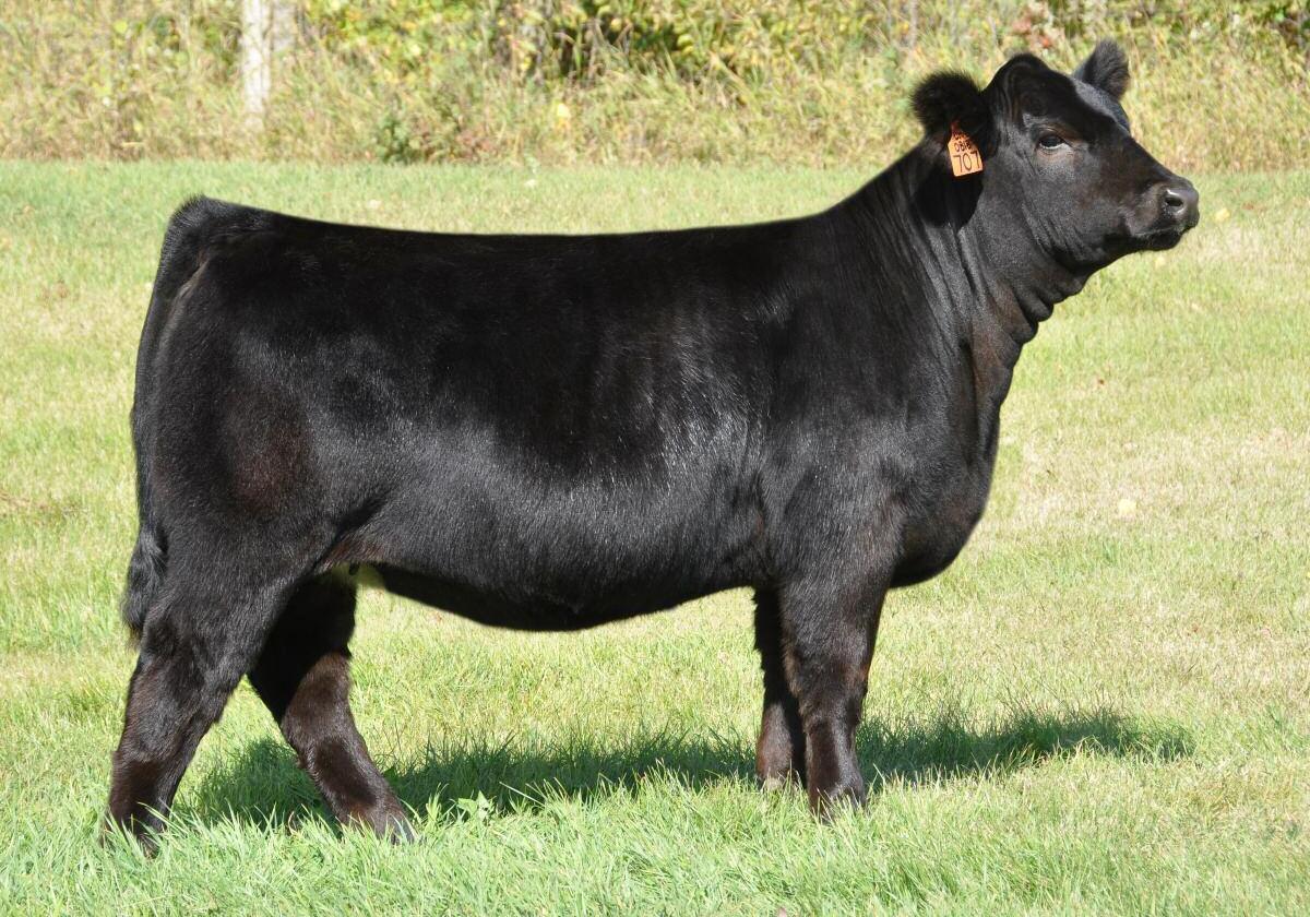 Here is another female to add to the Limflex division and a very exciting female she is at that. She is sired by the calving ease specialist Bulletproof on the top side and on the bottom you will find a descendent of the great Manuela cow family, letting her pedigree speak for itself. 704E has the makings of being a lead female for her new owner as she combines a classy look with a super sound structure. Whats even more impressive is the fact that she is off of a first calf female, that exhibits what we would call a picture perfect udder Ms Manuela has momma cow written all over her and we can’t wait to see the impact she creates on any new herd.