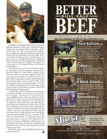 DARRELL ALVIN NELSON, of Glenwood, AB, beloved husband of Rose (nee Albizzati) Nelson passed away in Cardston, AB, on October 3, 2017, at the age of 91. He is survived by his siblings, Dorene (Murray) Bullock of Raymond, AB and his brother Jim (Louise) Nelson of Seattle, WA. He is survived by his children Duane (Linda) Nelson of Glenwood, Suzanne (Wayne) Bennett of Medicine Hat, and Arlene (Johnny) ZoBell of Raymond. He is also survived by 16 grandchildren and 30 great grandchildren. Darrell grew up on a farm in Glenwood where he developed a love for farming. He joined the RCAF on April 25, 1944. When trucking in the Crowsnest Pass, he met Rosie Albizzati and they were married on August 11, 1949 (over 68 years ago). While raising three children, Darrell did long haul trucking from coast to coast. In 1964, while continuing to truck, he started farming. In 1969, he fulfilled his lifelong dream of becoming a pilot and at the age of 86 became a member of the UFO (United Flying Octogenarians). At age 49 he started outfitting in the Northwest Territories and three years later he was joined by his son, Duane. For the next 21 years they operated as NWT Outfitters Ltd. During these years he did what he loved: spending time with his wife, having family and friends come visit, hunting, flying, fishing, and making new friends. After retiring from outfitting in the territories, he continued outfitting near his home, farming, trucking (he still had a Class 1 license), ranching and fishing. Darrell took many trips to Alaska and the west coast fishing with friends and family. He was a member of the Church of Jesus Christ of Latter Day Saints and gave many hours of service to his church and fellowmen. He always fulfilled his callings above and beyond the call of duty. He did many unknown acts of kindness and was loved and respected by all that came to know him. He will be sorely missed. RIP Darrell from your Gelbvieh friends. Gelbvieh guide • Spring 2018 • Page 29