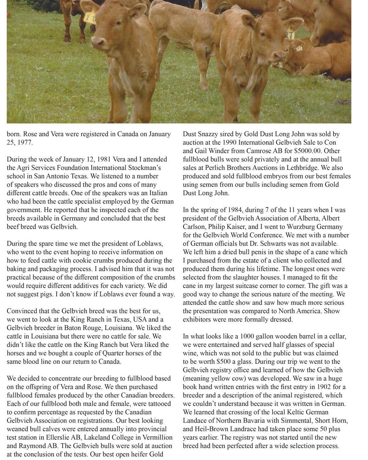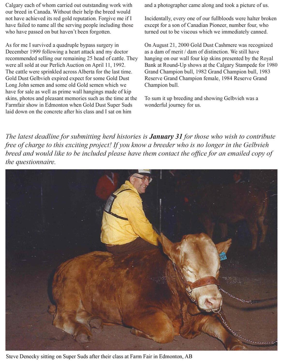 We have an exciting year ahead of us with celebrations being planned and the history book being published. Thank you very much to all of those who are helping to plan these events and who have contributed to our herd history book! Included in this issue is an order form for purchasing the history book. If you pre-order by March 1st, the cost per book is $75+shipping. If you purchase your history book after March 1st, the cost per book is $90+shipping. The final deadline to have any information or histories submitted for the herd history book is January 31st. We have also included a schedule of events and activities for the summer celebration and junior show in Stettler, AB in July. Included in this issue is an order form for promotional items to commemorate the 50th anniversary.