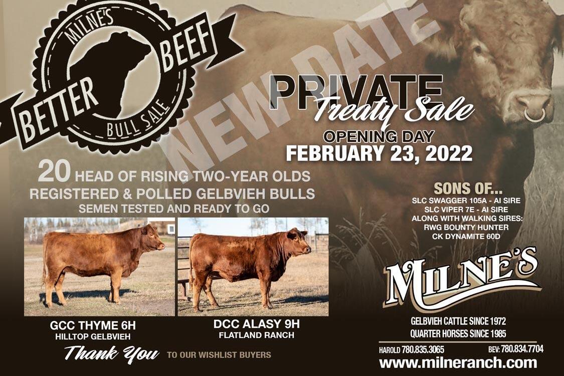 Feb. 23 – Milne’s Better Beef Opening Day Private Treaty Bull Sale, at the ranch, Fairview, AB