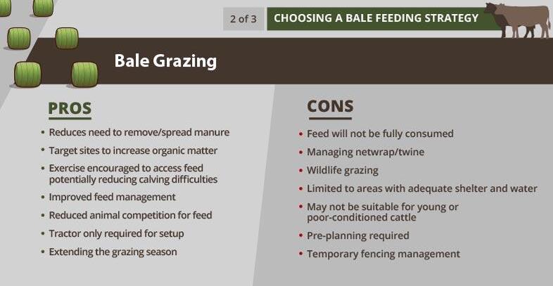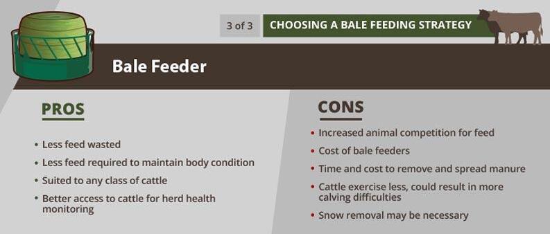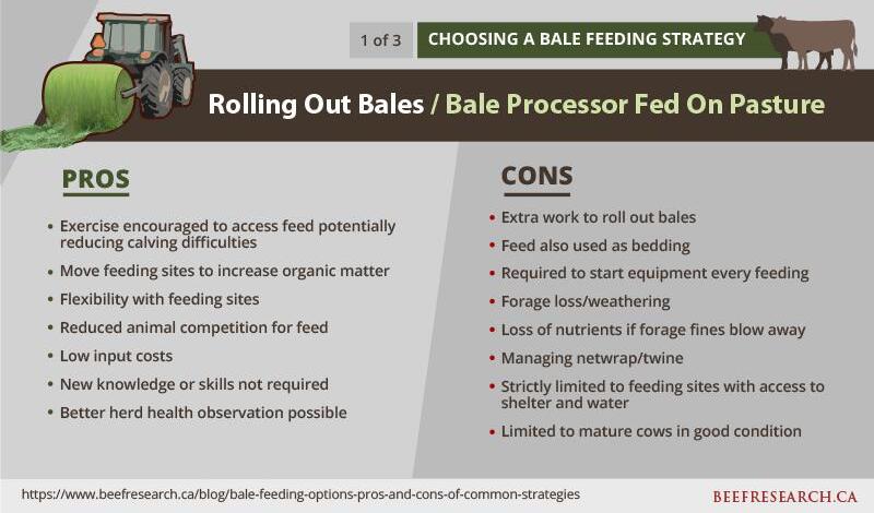 Bale feeding is common across Canada for all classes of cattle especially during winter months. There are many different management strategies to deliver bales as feed. To help you determine the best option for you and your cattle, see below for pros and cons of three common bale feeding strategies: