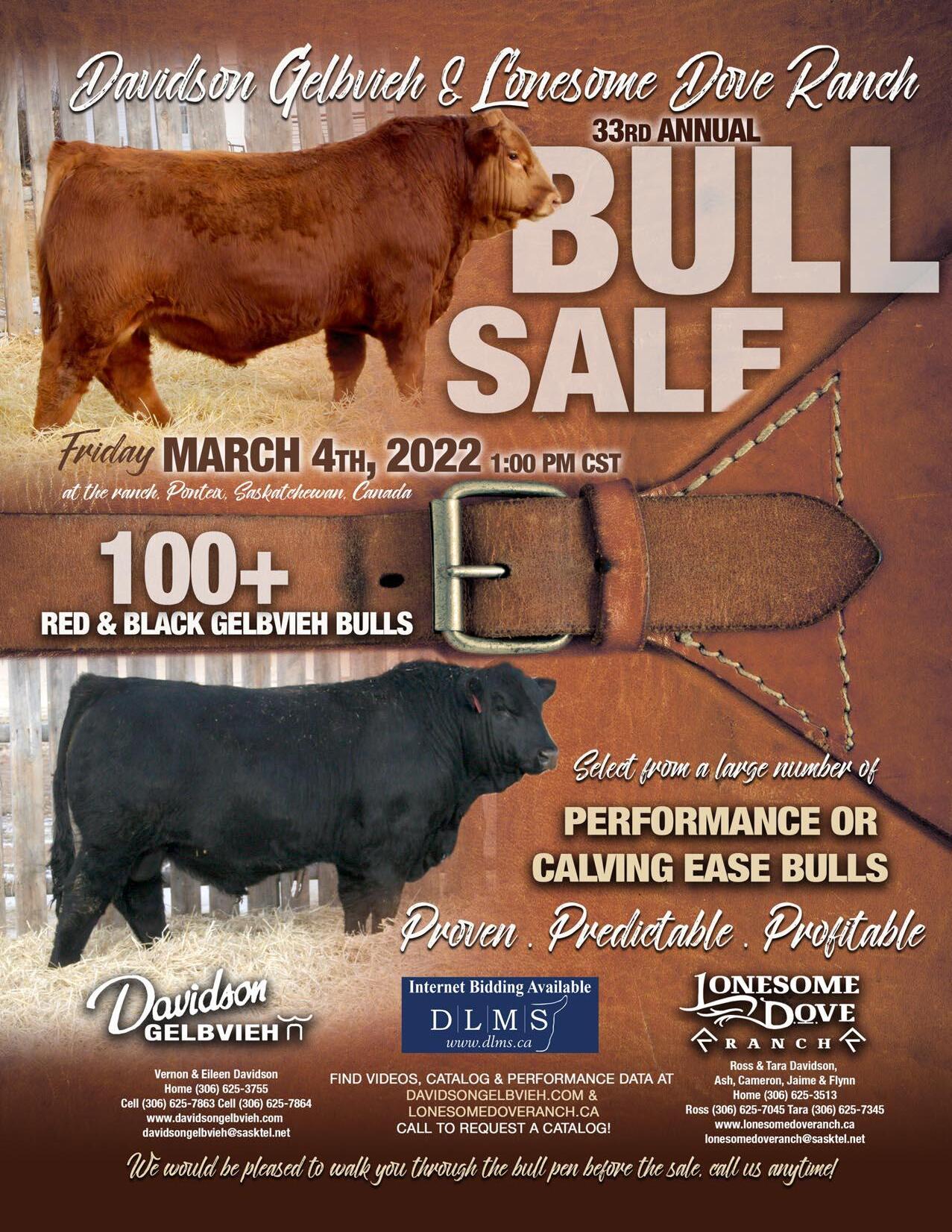 Mar. 4 – Davidson Gelbvieh & Lonesome Dove Ranch Annual Bull Sale at the ranch, Ponteix, SK