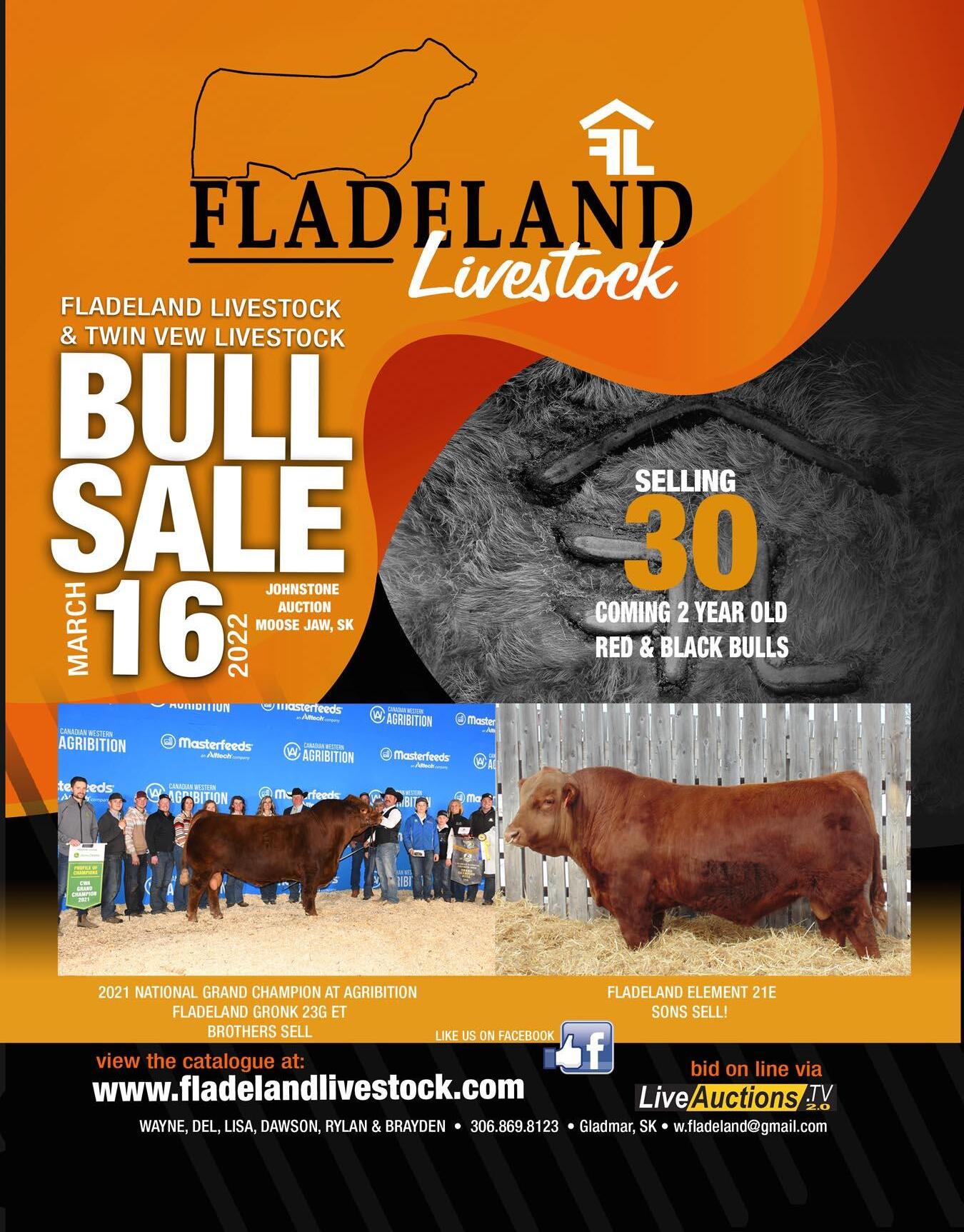 Mar. 16 – Twin View Livestock & Fladeland Livestock Bull Sale, Johnstone Auction Mart, Moose Jaw, SK