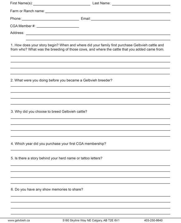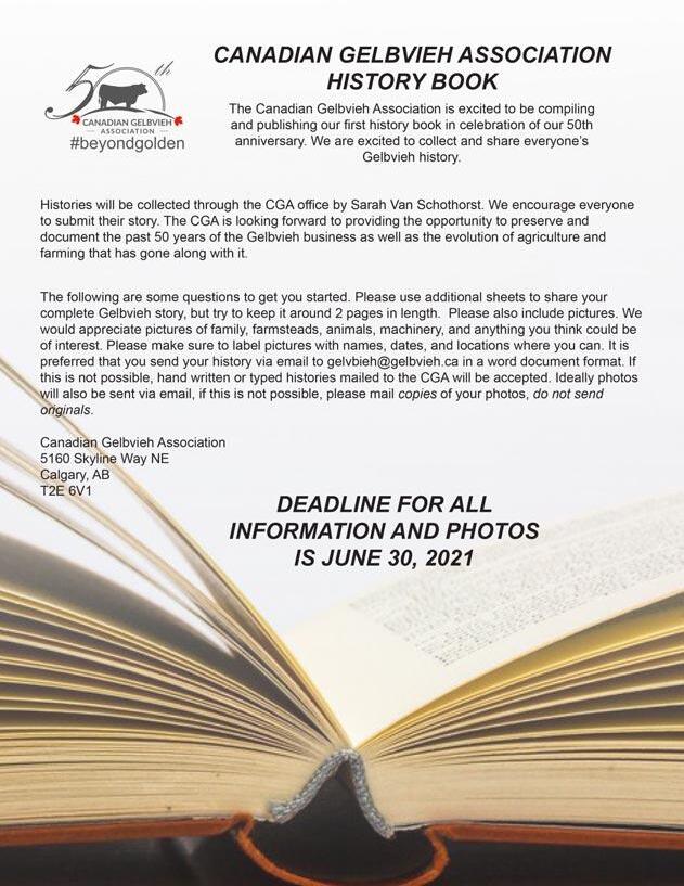 We would like to remind everyone to submit information for the Gelbvieh 50th Anniversary History Book. If you have stories to share, be sure to send them to the CGA office.