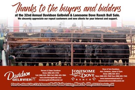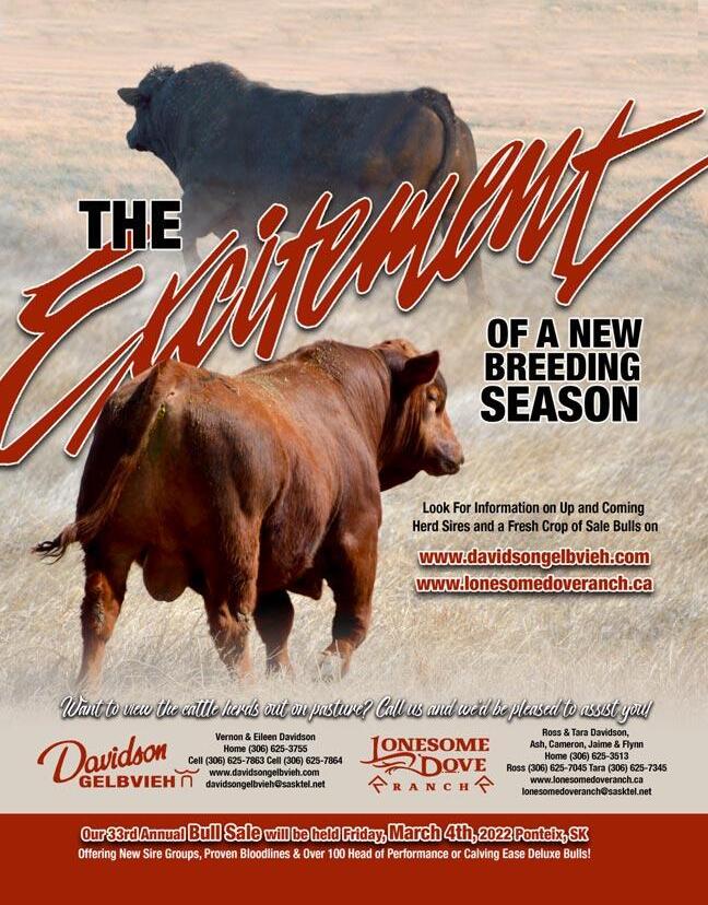 Mar. 4 - Davidson Gelbvieh & Lonesome Dove Ranch 33rd Annual Bull Sale, Ponteix, SK