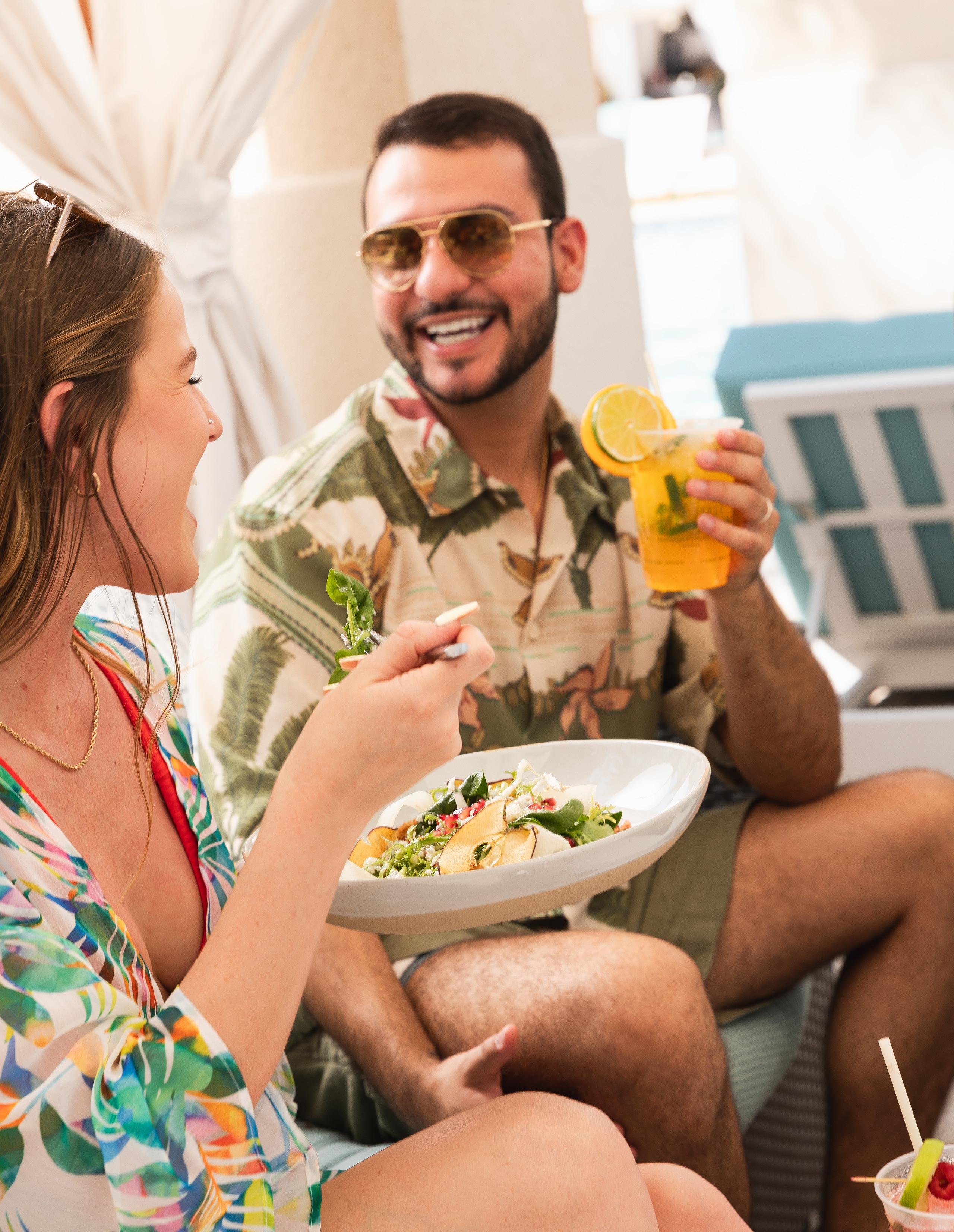 Open-air beach and poolside bar with quick bites, tropical drinks, and sunset views.