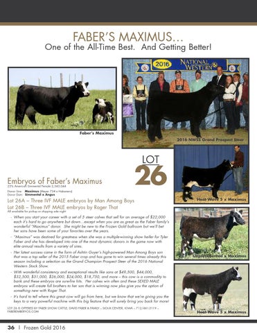 - When you start your career with a set of 5 steer calves that sell for an average of $22,000 each it’s hard to go anywhere but down…except when you are as great as the Faber family’s wonderful “Maximus” donor. She might be new to the Frozen Gold ballroom but we’ll bet her sons have been some of your favorites over the years. - “Maximus” was destined for greatness when she was a multiple-winning show heifer for Tyler Faber and she has developed into one of the most dynamic donors in the game now with elite annual results from a variety of sires. - Her latest success came in the form of Ashtin Guyer’s high-powered Man Among Boys son that was a top seller of the 2015 Faber crop and has gone to win several times already this season including a selection as the Grand Champion Prospect Steer of the 2016 National Western Stock Show.