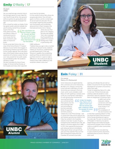 Student UNBC Yes, you read that age correctly. Emily is touch lives for the better. the youngest person to ever make this It is the world of science fairs where she city’s Top 40 Under 40 list. She earned it exceptionally shines. “One of Emily’s without question by going above and goals is to find a cure for a certain type beyond all expectations of people her of cancer,” said one advocate. Her sciage. ence project exploring that possibility If you missed her earlier accolades, Emily won local awards and scholarships, has gotten public attention already this advanced her to Team Canada at the year for being named Prince George’s International Science Fair in Taiwan Youth of the Year. where she won first She volunteers for That citation and this place in her category. Simon Fraser Lodge, one follows a litany of Her advocate added, St. Vincent de Paul social justice and sci“she is also investigatSociety, at the hospience causes she has ing the possibility of tal, and many other been involved in, and a patent” for research ways that touch lives taken to impressive findings she’s made for the better. levels. in partnership with On the social side, Emily is the viceUNBC professors. chair of the School District 57 Student “I believe that your age is only a number Advisory Council where she engages in and that you should not be underestianti-bullying initiatives and other topics mated, nor should you underestimate on the student agenda. She is also presiyourself, based upon it,” she said. dent of the Rotary Interact group raising “Anyone is capable of accomplishing awareness of numerous causes. She has anything if they are determined and won many awards for her public speakput their mind to it. I want to make a ing and debating skills. Her academic difference in the world; if one day my standing is stellar. research does make a difference, that She also volunteers for Simon Fraser would be a dream come true.” Lodge, St. Vincent de Paul Society, at the hospital, and many other ways that