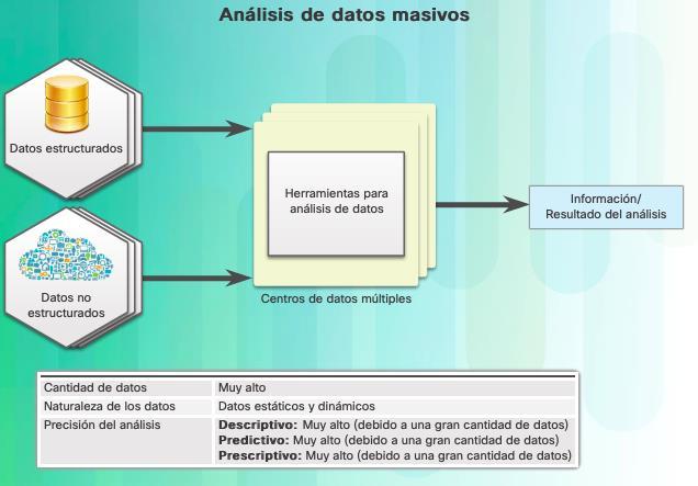 Datosmasivos (Big Data): es cuando sus datos son tan grandes, rápidos o complejos que se vuelve imposible guardarlos, procesarlos y analizarlos con aplicaciones tradicionales de almacenamiento y análisis de datos.