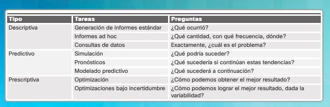 Existen varios tipos de análisis que pueden brindar a las empresas, las organizaciones y las personas la información que puede impulsar la innovación, mejorar la eficiencia y reducir los riesgos. El tipo de análisis de datos a implementar dependerá del problema que debe resolverse o de las preguntas que necesitan ser respondidas.