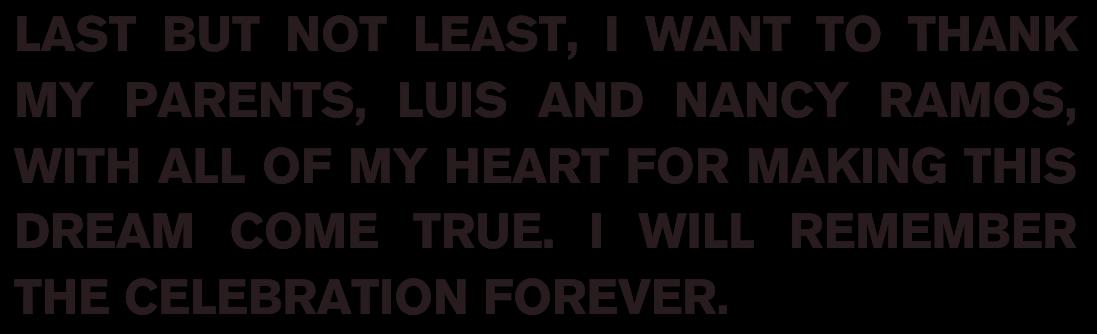 POR ÚLTIMO, PERO NO MENOS IMPORTANTE, QUIERO AGRADECER DE TODO CORAZÓN A MIS PADRES, LUIS Y NANCY RAMOS, POR HACER REALIDAD ESTE SUEÑO. RECORDARÉ LA CELEBRACIÓN POR SIEMPRE.