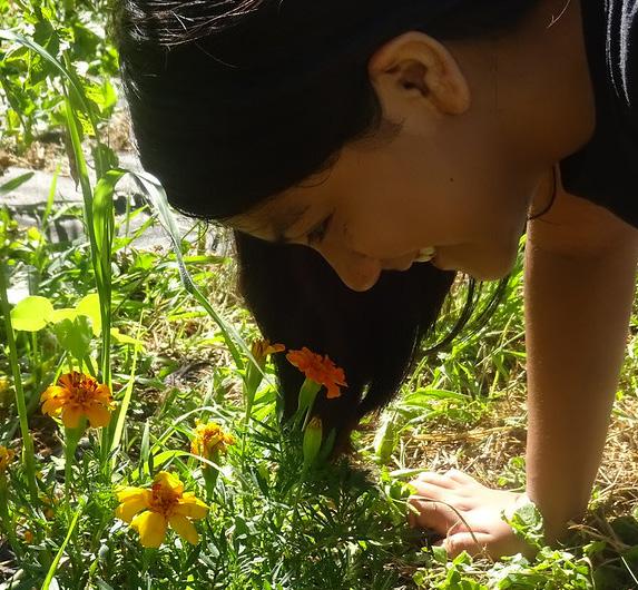 A program participant gets outside to smell the marigolds, smiling.