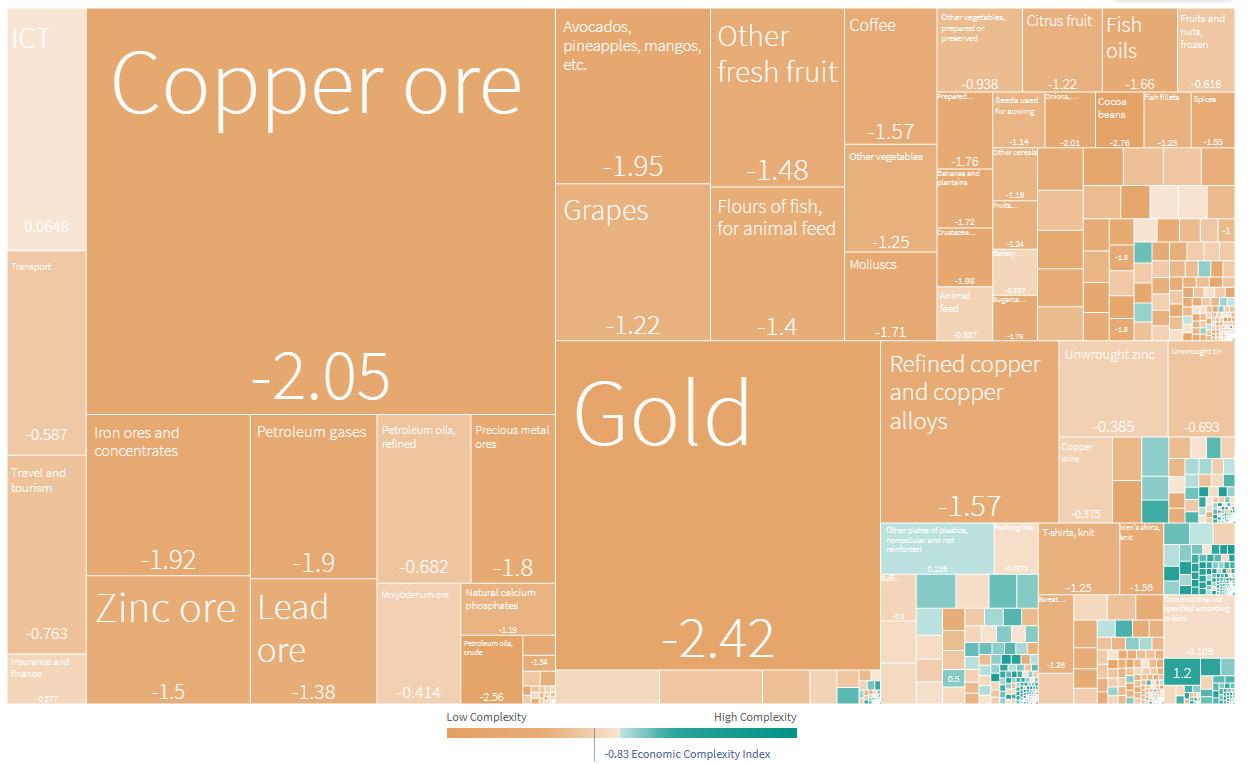 Growth Lab finds that countries that produce higher-complexity goods tend to grow faster. According to their Economic Complexity Index (ECI), Peru ranks as the country with the 105th most complex exports (out of 133) (Figure 7). Its ranking has worsened by 10 positions over the past decade.