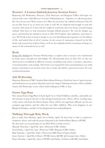 Princeton and Kingston UMC’s 2023 Lenten Study is called Living The Sabbath. There are nine primary components of the Lenten Program: