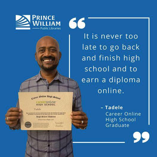Tadele's daughter, a former winner of a teen writing contest at PWPL, learned about the Career Online High School program at Haymarket Gainesville Library and encouraged him to apply. Now, as PWPL's third COHS graduate, Tadele hopes his success will encourage others to apply for the program, too.