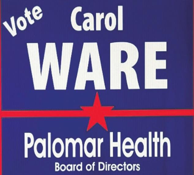Myvisionisclear:Improvepatientcareandinsiston transparentoversightoftaxpayerdollars. Wemustrestore: •Valuingemployees •Increasingstaffing •Loweringwaittimesinemergencyrooms •Investinginpeopleandtechnologies ItistimeforthePalomarHealthBoardofDirectors toprovidevisonandoversightthatwillempower doctors,nurses,andmedicalsupportstaffinstead ofprofiteers. Todothatitwilltakerealleadership whichbeginswithvotingfor CAROLWARE PALOMARHEALTHBOARDDIVISION7 Facebook: wareforpalomarhealth Instagram: wareforpalomarhealth www.wareforpalomarhealth.comwareforpalomarhealth@gmail.com FINDING OR SELLING A HOME? CONTACT SHAY REALTORS AT 858-449-7355 AND ASK ABOUT OFF MARKET HOME OPPORTUNITIES.