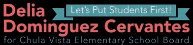 all be proud of — where students excel and families thrive. I hope you will consider joining me in this effort. Together, we WILL put students first. Delia’s Priorities Students in CVESD are underachieving, with only half of students performing at grade level in reading and math. Delia will work to ensure school staff and students have the necessary resources to be successful. Paid for by Delia Dominguez Cervantes for School Board 2022 Delia will prioritize student mental health and ensure that every student has a safe, happy, healthy learning environment on campus. Our children are better served when parents and families are able to play a part in the education of their child. Delia will make sure parents are welcome and heard. About Delia ★ Retired Administrator, San Diego County Health and Human Services Agency ★ Leader and Member, Latino American Political Association ★ Former Member, City of San Diego Latino Advisory Board ★ Domestic Violence Support Volunteer, SBCS - Casas Seguras ★ Committed Mother, Grandmother and Tia Nana Delia