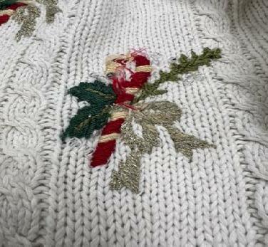 That is what I think of when I happen upon vintage handknits or holiday sweaters. I say quietly to myself, “Now look at you! Filthy, worn to abuse and in dire need of a makeover.” Feeling certain I can resurrect and re home them, they are tossed into my car and taken to the studio. Much like when The Grinch told Cindy Lou Who: “Why, there’s a light that won’t light on one side, so I’m taking it back to my workshop, my dear; I’ll fix it up there and bring it back here.”