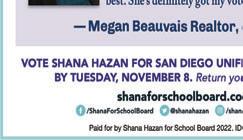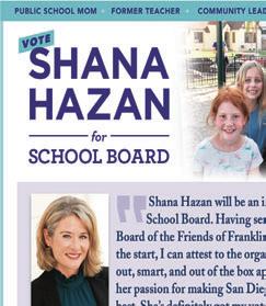 Shana Hazan brings the leadership, experience, and insight to help our kids succeed so every one of them can reach their full potential. She came in first in JuneÕs competitive 3way primary election with more than 52% of the vote. Shana is endorsed by the San Diego Union-Tribune, elected and community leaders, and more than 6,500 teachers across San