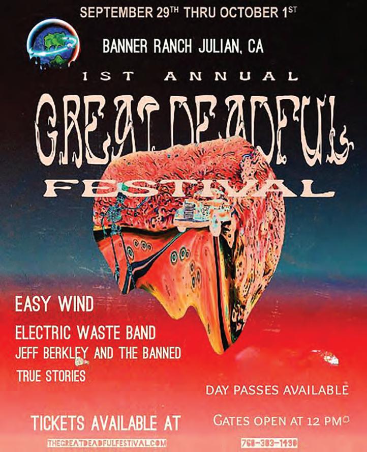 Grateful Dead fans won’t want to miss the 1st Annual, The Great Deadful Festival, at Banner Ranch, in Julian, CA., from Sept. 30Oct. 1. The event’s expansive schedule includes music from Grateful Dead tribute groups, Easy Wind and Electric Waste Band, as well as Americana favorites, Jeff Berkley & The Banned and 1960’s influenced indie rock combo, True Stories.