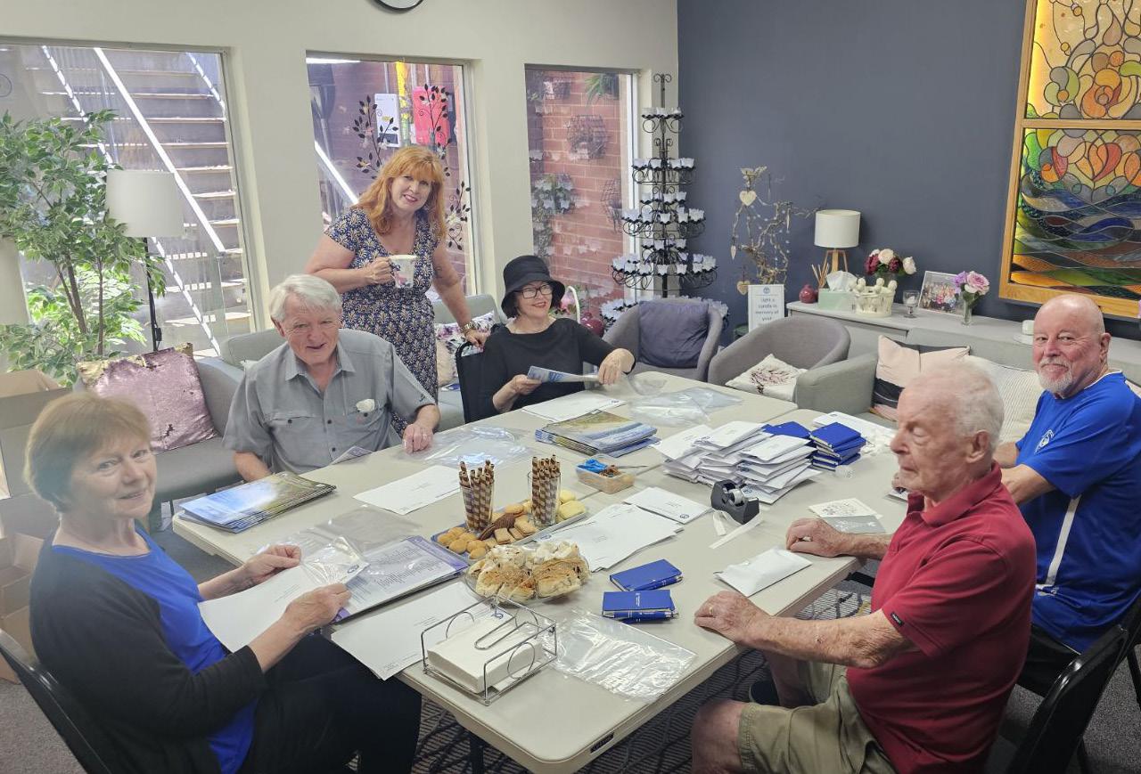 Photo below was taken at the “SUMMER” magazine mailout and shows from l-r - Sandra, John B, Jane (staff), Rai, Phil, John K.