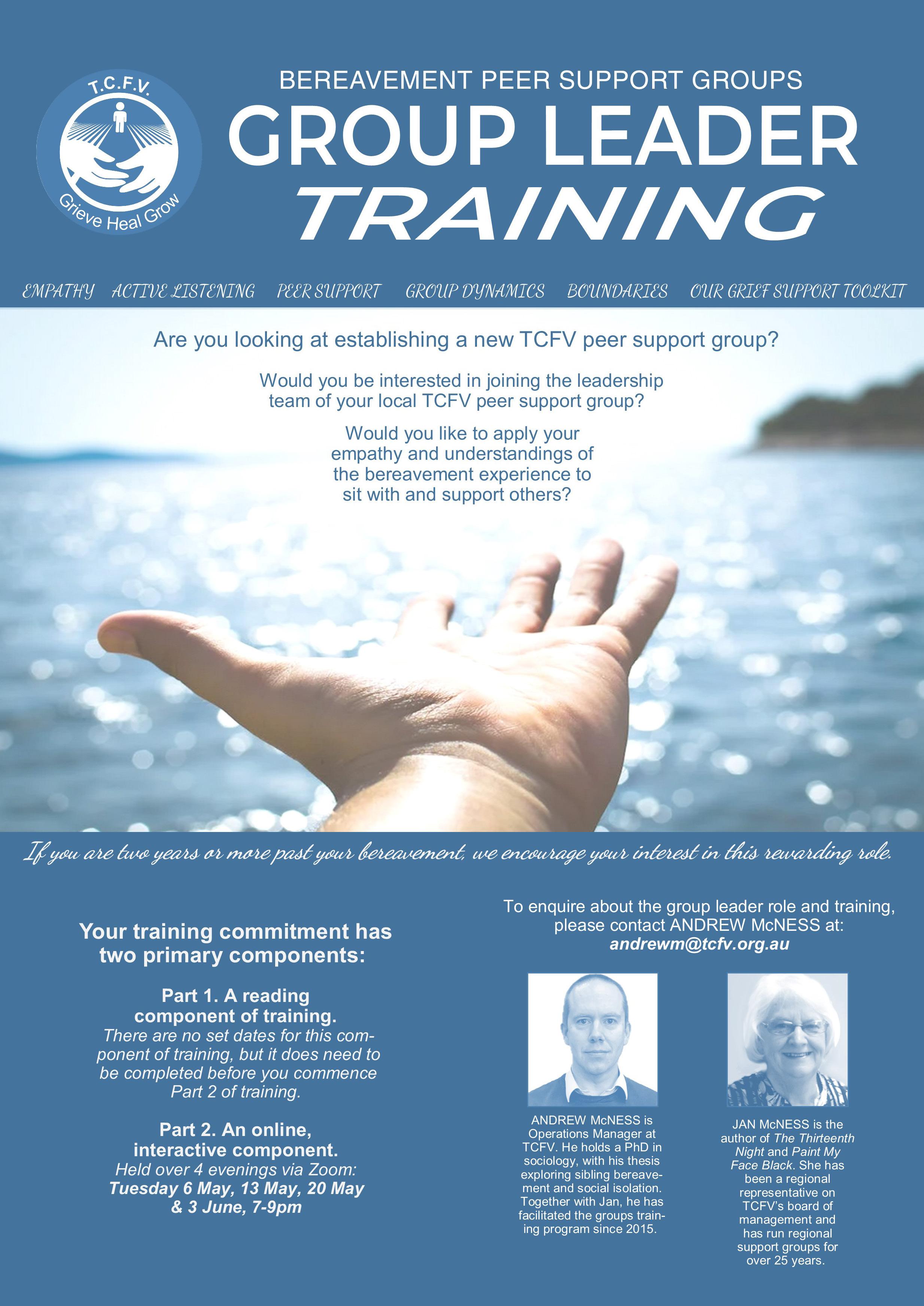 We highly recommend you speak with the group leader prior to your first meeting at any TCFV group. Call TCFV on 9888 4944 (Melbourne)/1300 064 068 (regional) and we can help arrange a chat. Speaking with the leader is a valuable introduction to the group and what it can offer you in your grief journey.