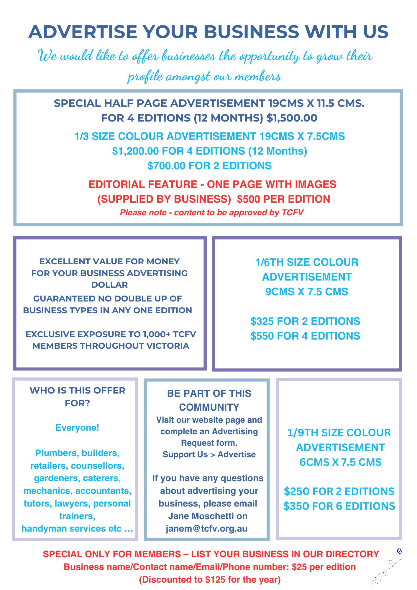 Note 2: Sometimes, group meeting details need to be updated between when the magazine goes to print and when it is delivered to your letterbox or Inbox. For the most up-to-date listing of meetings, please visit: www.tcfv.org.au