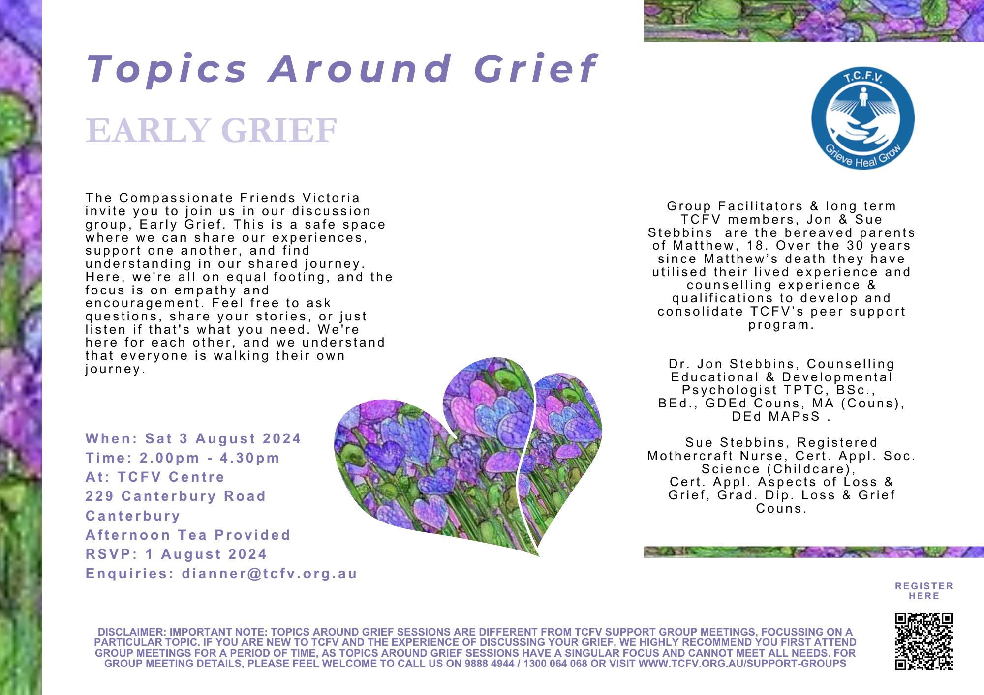Victoria (TCFV) enables you to access many vital support services and attend social activities whilst demonstrating your support for a society that is aware and understands the impact of grief and bereavement following the death of a child, sibling or grandchild.