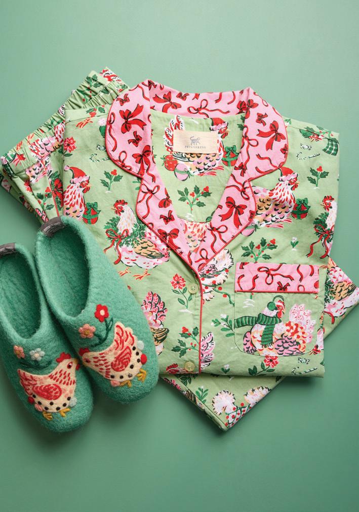 Holiday Hens Long PJ Set | $168, Holiday Hens Slippers | $98