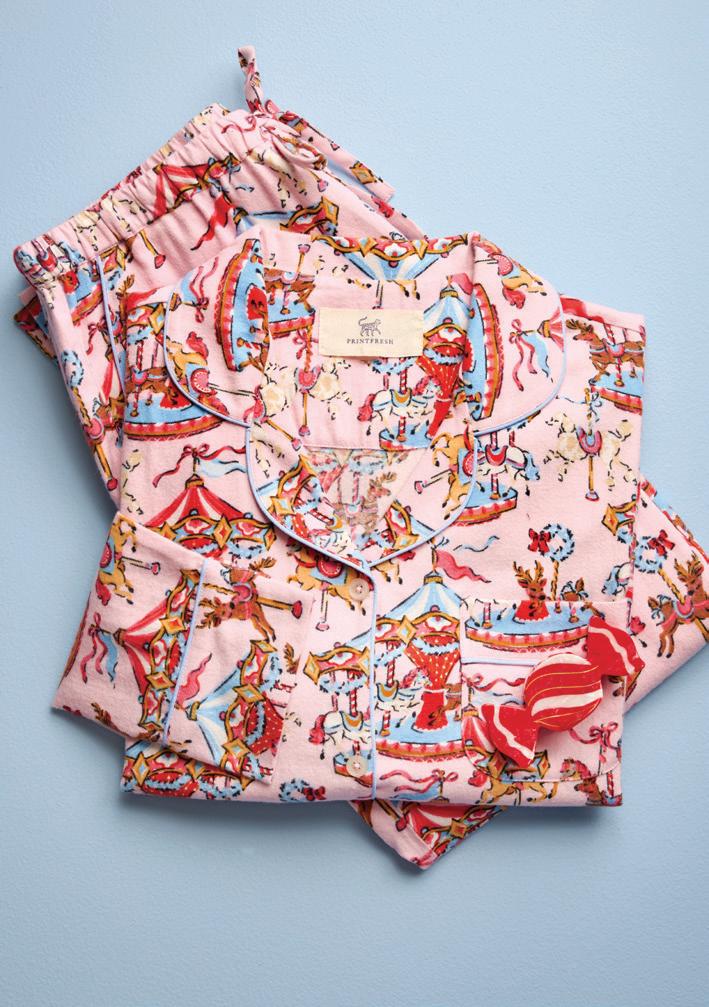 8. Cozy midweight flannel PJs in our nostalgic carousel print, complete with a candy-shaped hair clip for extra cheer.