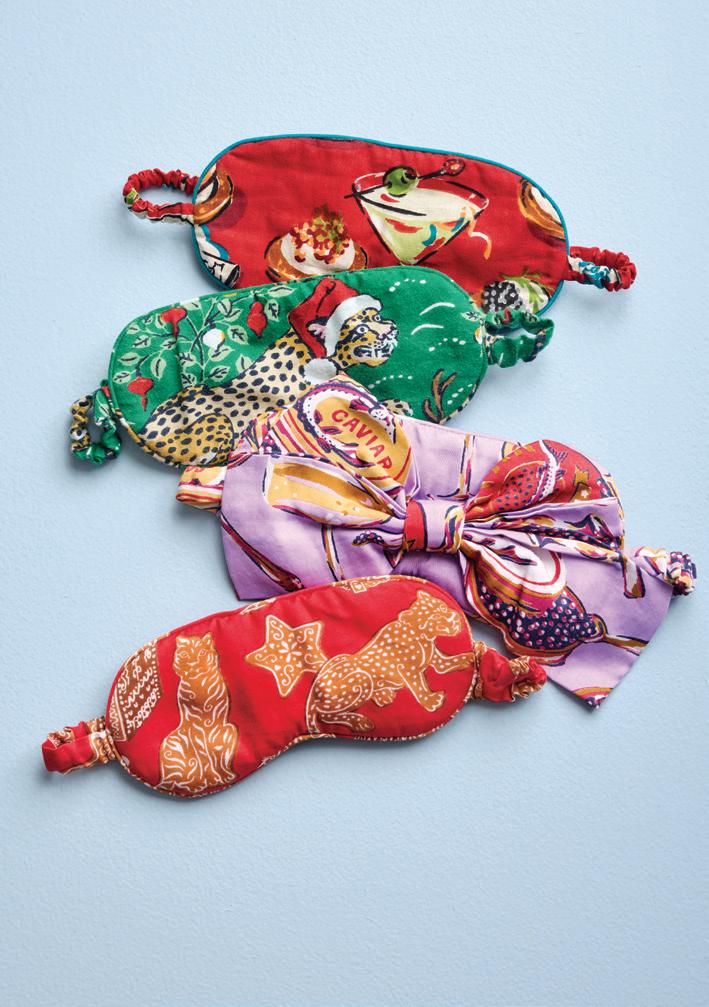 Blinis & Martinis Sleep Mask | $28, Very Merry Bagheera Sleep Mask | $28, Champagne & Caviar Eco Satin Bow Sleep Mask | $34, Gingerbread Party Eco Satin Sleep Mask | $34