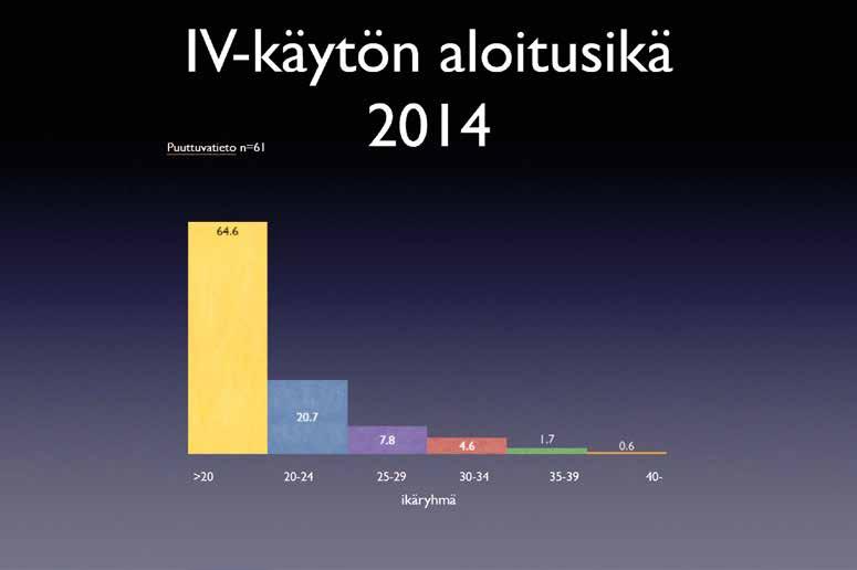 THL:n tilastojen mukaan pistämällä päihteitä käyttävistä 64.6% on aloittanut suonensisäisen käytön alle 20-vuotiaana. Luotettavaa dataa siitä, kuinka suuri osa heistä on ollut alaikäisiä ei ole saatavilla.