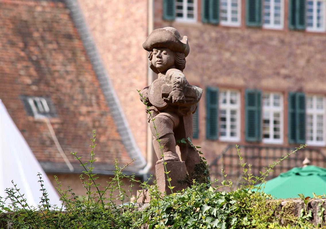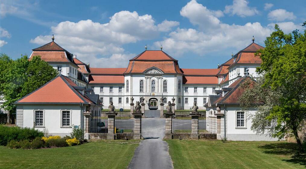 Form und Anordnung der Gebäude um den recht eckigen Hof haben sich seither nicht geändert. Im Westen (links) der Herrenbau, ihm gegenüber im Osten der Turmbau, an den sich zu beiden Seiten die Stallungen anschließen. Im Süden der Prinzenund der Kavalierbau. Auf der nördlichen Hofseite liegen der Prinzessinnen- und der Damenbau.