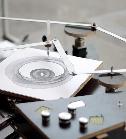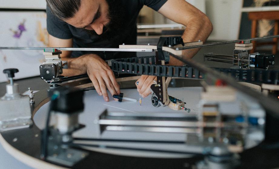 Kunst zu kaufen ist die eine Sache, den Prozess des Kunstschaffens hautnah zu erleben eine ganz andere. Robert Balke macht mit seinen interak tiven Zeichenmaschinen genau das möglich. Die Idee hierzu kam dem Kommunikationsdesigner vor mehr als 10 Jahren während seines Studiums. Sein Interesse an Kunst und mechanischer Kons truktion führten ihn dazu, verschiedene Zeichen maschinen zu bauen, die – mittels Motoren und Armkonstruktionen, die Stifte führen – in der Lage sind, „selbst“ Kunstwerke entstehen zu lassen. Vom 1. bis 3. Oktober 2022 präsentiert er bei FEINWERK auf Schloss Fasanerie seine Arbei ten und Maschinen und zeigt so den Prozess des Kunstschaffens als spannendes Live-Erlebnis.